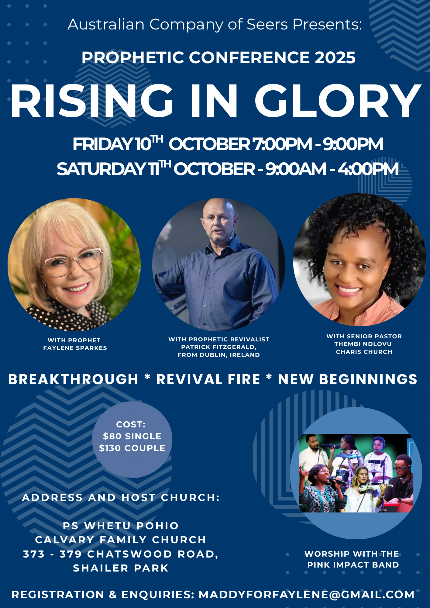 Rising in Glory Prophetic Conference Friday, October 10, 2025 7:00 PM 19:00 Saturday, October 11, 2025 4:00 PM 16:00 373-379 Chatswood Road Shailer Park, QLD, 4128 Australia (map) Google Calendar ICS